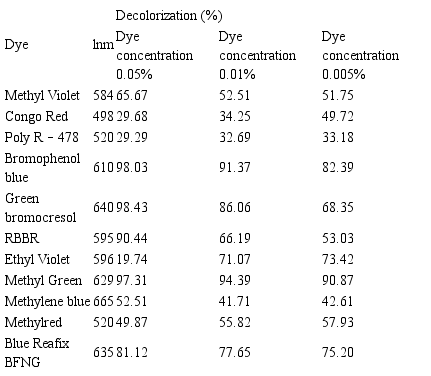 To study of crude laccase capacity (after optimization) in decolorization the following dyes were used: Remazol brilliant blue (RBBR), Ethyl violet, Methyl violet, Methyl green, Methylene blue, Poly R-478, Congo red, Bromophenol blue, Green bromocresol, Methyl red and Brilliant Blue Reafix BFNG. A reaction mixture containing 2.0 mL of dye in 0.05 mol L-1 sodium acetate buffer (pH 5.0) and 2.0 mL crude laccase (diluted to give a final activity of 3 U) was incubated at 28°C in the dark. After 24 hours, the decrease in absorbance was measured at the maximum absorbance of each dye in a UV and VIS Shimadzu Spectrophotometer and expressed in terms of percentage. In parallel, a boiled crude laccase preparation was used as negative control.