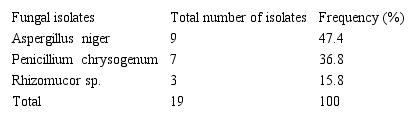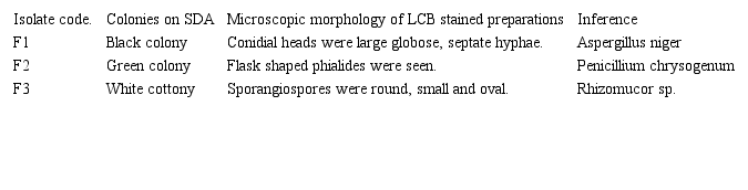 On microscopic examination, large globose conidial heads were seen in Aspergillus niger, flask shaped phialides were observed in Penicillium chrysogenum and small round sporangiospores were seen in the case of Rhizomucor sp. as presented in Table 2.