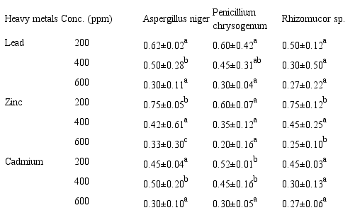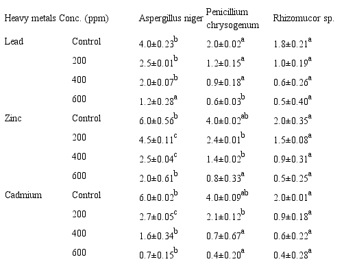 This study revealed that fungal isolates demonstrated different levels of growth and tolerance to heavy metal concentrations at different days intervals which concur with the study of Hashem and Bahkali (1994) who reported that tolerance of fungi to heavy metals at different concentrations in the environment revealed their adaptation and subsequent growth and development in heavy metals polluted environment.