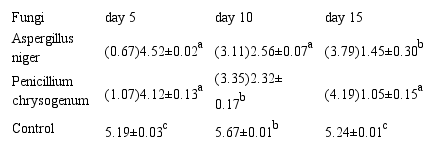 Table 5 revealed the level of lead removal by Aspergillus niger and Penicillium chrysogenum. It was observed that the concentration of lead was reduced significantly by both organisms as compared with the control at ppm concentration of 5.19, 5.67 and 5.24 at day 5, 10 and 15 respectively (Table 5). However, Penicillium chrysogenum showed higher lead removal of 1.07ppm, 3.35ppm and 4.19ppm from the control ppm concentration of 5.19, 5.67 and 5.24 as compared with Aspergillus niger with lead removal of 0.67ppm, 3.11ppm and 3.79ppm on the 5th, 10th and 15th day respectively (Table 5). Statistical analysis revealed that there was no significant different between the lead removal of Penicillium chrysogenum and Aspergillus niger at day 5 but there was significant difference in the lead removal of Penicillium chrysogenum and Aspergillus niger on the 10th and 15th day (Table 5).