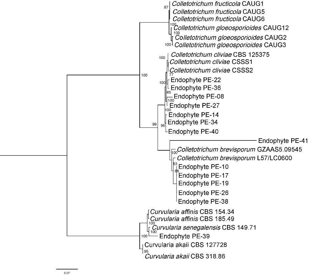 The results of the BLASTn analysis are shown in Table 1. Phylogenetic analysis confirmed the molecular identification of endophytes PE-08, PE-14, PE-22, PE-27, PE-34, PE-36, PE-40, and PE-41 at the genus level as Colletotrichum sp. The taxonomy of PE-10, PE-17, PE-19, PE-26, and PE-38 was confirmed at the species level as Colletotrichum brevisporum [ITS BLASTn 98%; β-tubulin BLASTn 100%; 100% Bayesian probability (BP)], while PE-39 was confirmed as Curvularia senegalensis (ITS BLASTn 97%; 100% PB) (Figure 1).