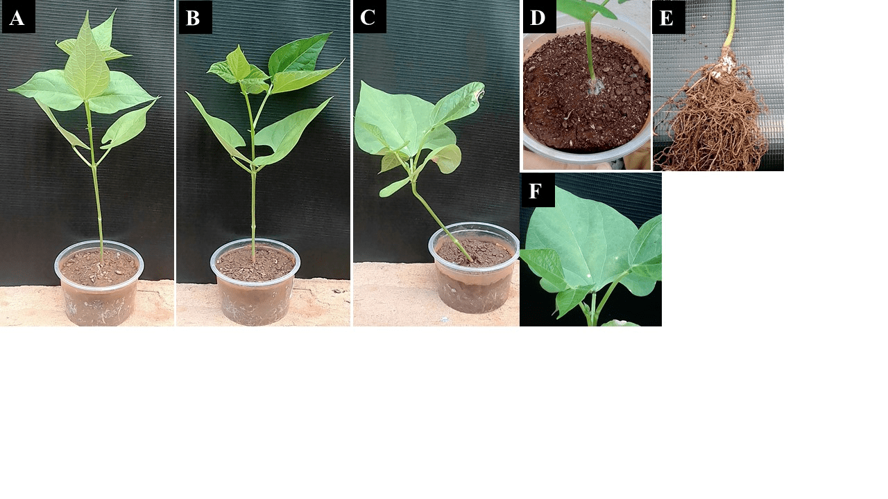 Table 4 details the biometric parameters related to the vegetative growth of bean plants. Plants inoculated only with the endophyte Colletotrichum sp. PE-36 (T1) was symptomless and showed the difference for number of leaves and root length when compared to control plants (C) and other treatments (T2 and T3). Our findings suggest that the endophyte strengthened the growth promotion of the treated plants (T1). The T2 treatment presented inferior results in all biometric parameters analyzed. In addition, the T2 treatment presented whitish lesions in the root system apparently caused by the mycelial growth of Colletotrichum sp. CNPUV378, which were not found in the other treatments, suggesting that plants inoculated with endophyte + pathogen (T3), the endophyte was able to soften the propagules of the pathogen Figure 3.
