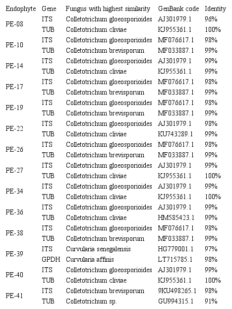 For the molecular identification, genomic DNA was extracted as described by Pamphile and Azevedo (2002) except that endophytes were previously grown for seven days in PDB dishes (Potato Dextrose Broth, pH 6.8) (Himedia, Mumbai, India). Amplification of the ITS1-5.8S-ITS2 (V9G 5’-TTACGTCCCTGCCCTTTGTA-3’ and ITS4 5’-TCCGTAGGTGAACCTGCGG-3’) (Invitrogen, Carlsbad, CA, USA) was carried out as described by White, Marrow, and Jones (1990) and Van Den Ende and De Hoog (1999), with initial denaturation at 94ºC for 5 min.; followed by 35 cycles of denaturation at 94ºC for 30 s, annealing at 48ºC for 50 s, and extension at 72ºC for 2 min.; followed by a final extension at 72ºC for 5 min. To amplify the partial gene of β-tubulin (T1 5’-AACATGCGTGAGATTGTAAGT-3’ and Bt-2b 5’-ACCTCAGTGTAGTGACCCTTGGC-3’) (Invitrogen, Carlsbad, CA, USA) were used the protocol described by Glass and Donaldson (1995) and O’ Donnell and Cigelnik (1997) with initial denaturation at 94ºC for 4 min.; followed by 40 cycles of denaturation at 94ºC for 30 s, annealing at 55ºC for 1 min., and extension at 72ºC for 1 min.; followed by a final extension at 72ºC for 3 min. Amplification of the glyceraldehyde-3-phosphate dehydrogenase (GPD1F 5’-CAACGGCTTCGGTCGCATTG-3’ and GPD2R 5’-GCCAAGCAGTTGGTTGTGC-3’) (Invitrogen, Carlsbad, CA, USA) was amplified according to Berbee, Pirseyedi, & Hubbard (1997) with initial denaturation at 96ºC for 2 min.; followed by 25 cycles of denaturation at 96ºC for 1 min., annealing at 52ºC for 45 s, and extension at 72ºC for 45 s; followed by a final extension at 72ºC for 10 min.