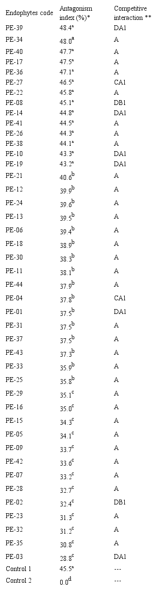 Many studies have investigated the in vitro activity of endophytes against Colletotrichum pathogens. Rabha, Naglot, Sharma, Gogoi, and Veer (2014) showed that the indexes of antagonistic activity of fungal endophytes against Colletotrichum camelliae ranged from 18.33 to 36.73. The inhibition indexes (17.52 to 49.71%) obtained by Bongiorno et al. (2016.) were similar to those obtained in this study (28.8 to 48.8%). Supporting our results, literature data has already been reported on the deadlock (mutual inhibition) at mycelial contact (type A) as the most frequent in the pathogen-endophytes competitive interaction (Campanile et al., 2007; Polonio et al., 2015; Wang et al., 2015; Bongiorno et al., 2016), in which mutual fungal inhibition occurs and neither microorganism is able to overgrow the other (Innocenti et al., 2002; Oliveira et al., 2019).