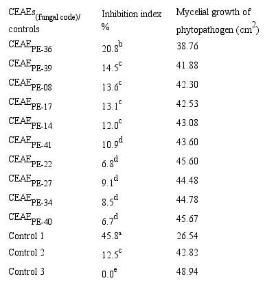 Table 3 describes the results obtained for the in vitro antifungal activity of CEAEs of secondary metabolites. The higher IP% (=20.8%) against the Colletotrichum sp. CNPU378 was reported for the extract (named as code CEAEPE-36) obtained from the endophyte PE-36.