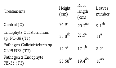 Different mechanisms of in vivo biocontrol can be employed alone or together with other strategies to trigger direct or indirect responses to overcome the pathogenicity of the causal agent (Ghorbanpour, Omidvari, Dahaji, Omidavar, & Kariman, 2018). Consistent with our in vivo assay, Rodríguez et al. (2016) reporting that the application of a suspension of an endophytic fungus on necrotic leaves reduced the spore production of the pathogen after 21 days. In addition, the authors evaluated the endophytic colonization through plant height, root length, biomass, and the number of leaves. Li, Hwang, Huang and Huang (2018) described an endophyte able to carry out the suppression of Fusarium wilt of tomato plants and beefing up their growth, mainly through the absorption of nutrients.