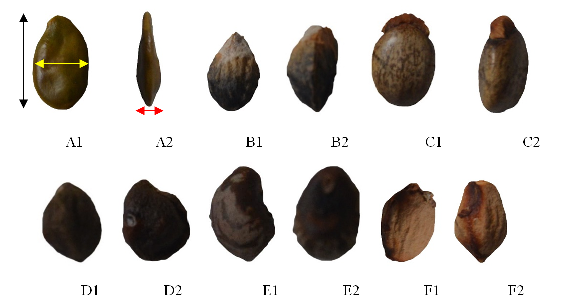 The seeds of each matrix were measured for length (C, mm), measured from base to apex, width (L, mm) and thickness (E, mm) measured at seed midline. Measurements were made with the aid of a 0.01 mm digital caliper (Nogueira, Medeiros Filho, & Gallão, 2010). While the measurements were being made some seeds were also photographed (Figure 1). Seed volume (V, mm³) was calculated from the length x width x thickness ratio.