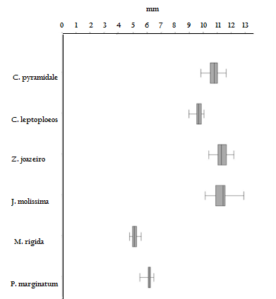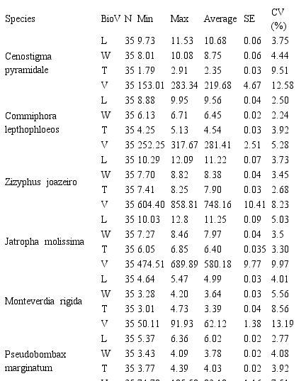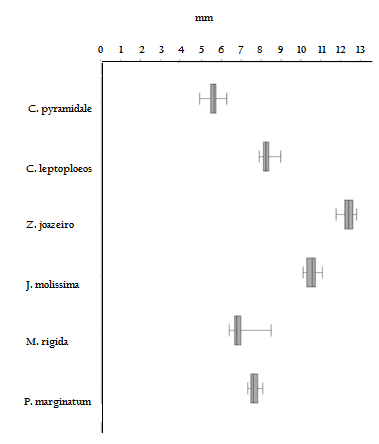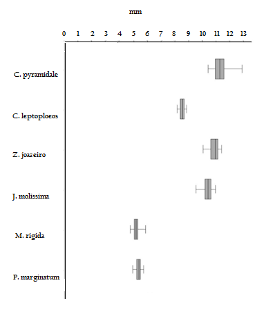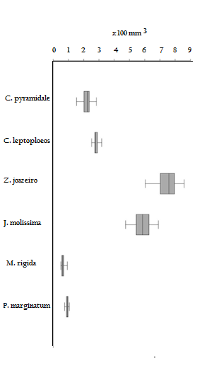 Volume was the variable with the highest coefficient of variation in C. pyramidale and M. rigida, differing greatly from C. lepthophloeos, which showed a low variation. The thickness also varied substantially when compared to C. pyramidale and Z. joazeiro.