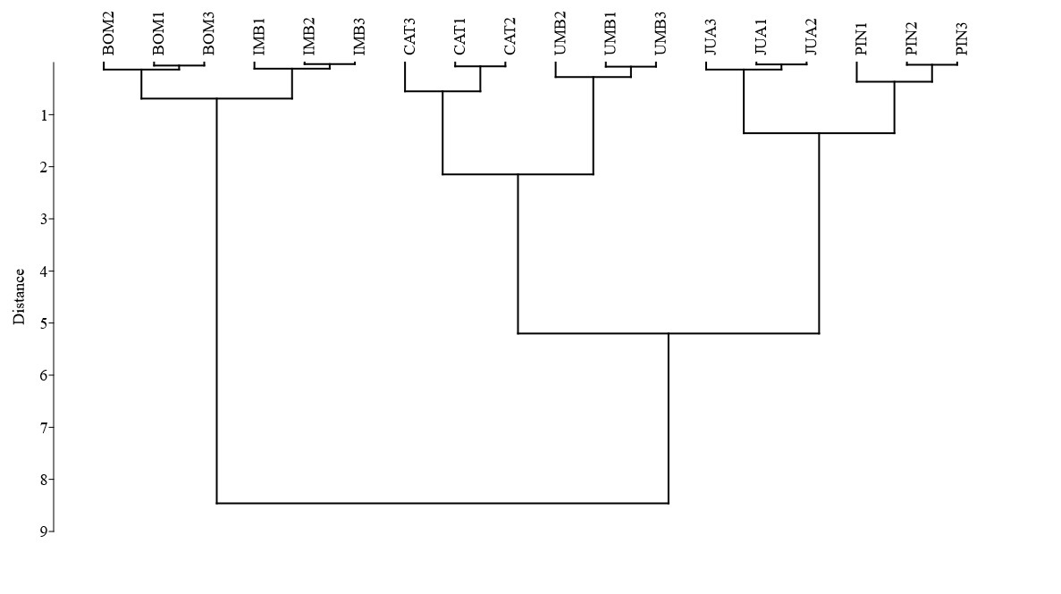 Euclidean distance showed a separation between the biometric parameters of M. rigida and P. marginatum seeds and the others. This separation was due to the smallest variation in all parameters in the seeds of these species. It was also possible to verify that there was variation between individuals of each species, and in C. pyramidale the individual CAT3 presented greater variation. The cophenetic coefficient was 0.8485, which demonstrates a good fit between the graphical representation and its matrices (Figure 6).