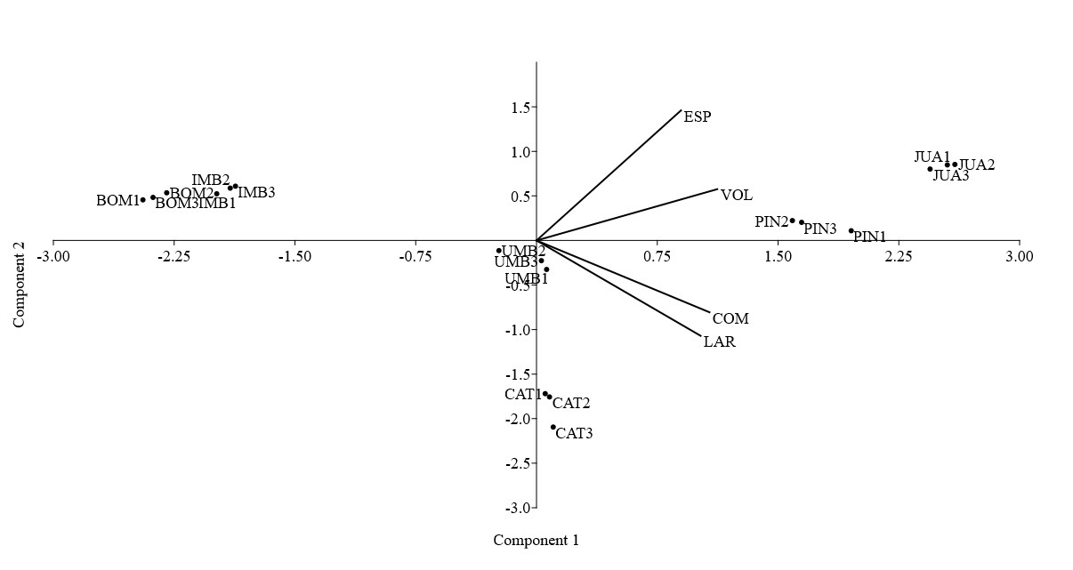 The PCA indicated which variables most influenced the ordering of points on the axes (Figure 7). The analysis of axis 1 with 78.73% of the data variation indicates that the volume variable was the one that ordered the organization of the points. While for axis 2, with 20.27% the variable was the thickness. Therefore, Z. joazeiro and J. mollissima presented the largest volumes (size) while M. rigida and P. marginatum presented seeds with smaller volume. The seeds of C. pyramidale and C. lepthophloeos presented low thickness when compared to the others. The proximity of C. lepthophloeos seed data to the point of interception of the PCA axes shows that there is no variation in this data.