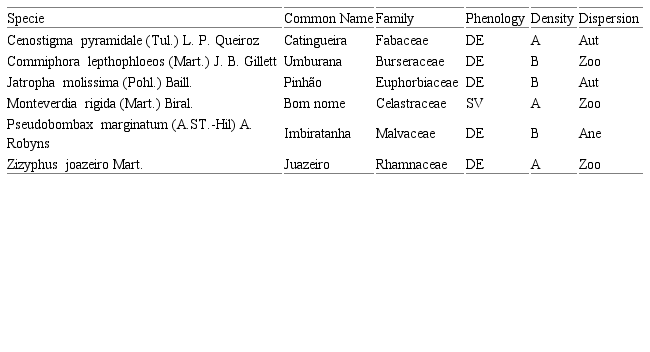 We did not identify on the PCA the formation of clusters that strongly characterize a relationship with phenological groups or modes of dispersion. However, when comparing the formed groups (I, II and III) with the works of Carvalho, Souza, and Trovão (2012), Cabral, Sampaio, and Almeida-Cortez (2013) and Silva et al. (2014), in which Caatinga species were categorized according to ecological succession stages, we noticed a tendency to separation by this condition. For example, the species M. rigida and P. marginatum, which formed group I, are classified as late secondary. Group II formed by C. pyramidale and C. leptophloeos were characterized as intermediate stage of succession. Jatropha molissima and Z. joazeiro formed the pioneer group III.