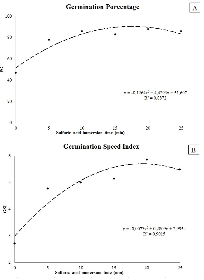 For seed germination percentage of P. moniliformis seeds submitted to different periods of immersion into sulfuric acid, a quadratic behavior was verified for the different times. The values obtained for 5, 10, 15, 20 and 25 minutes of acid immersion were 78, 86, 83, 88 and 86%, respectively, while intact seeds showed a germination of 47% (Figure 1A).