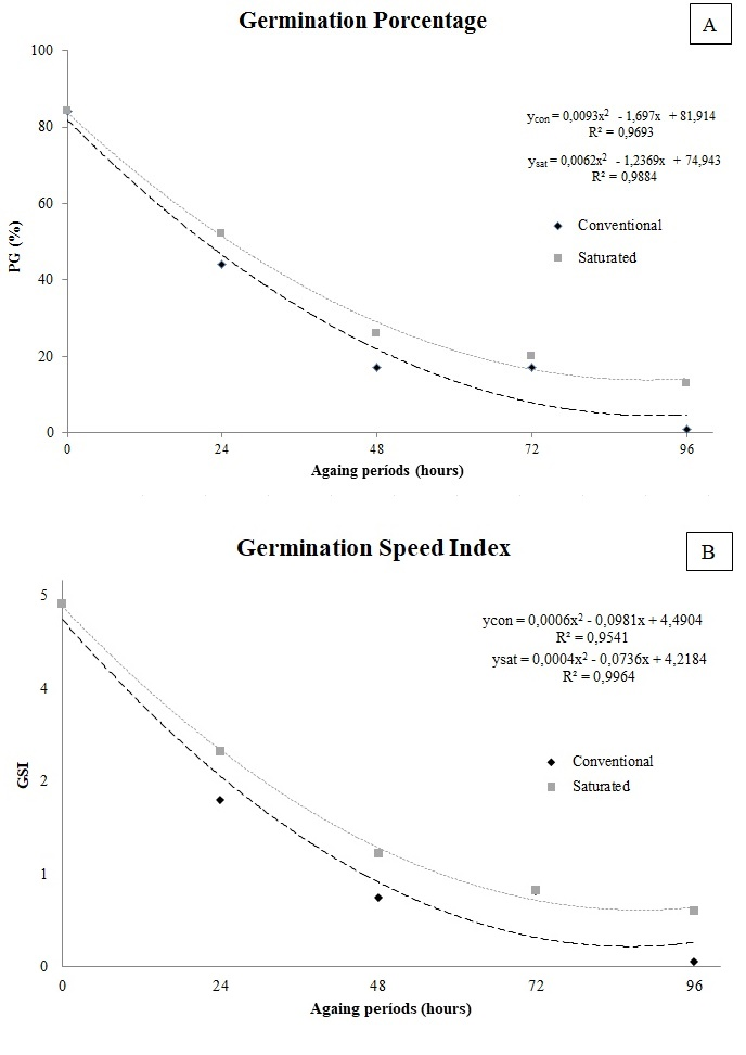 Before and after each aging period, regardless of the method, the seed water content was determined by the greenhouse method at 105 ± 3ºC for 24 hours, according to the Seed Analysis Rules (RAS) (Brasil. Ministério da Agricultura, Pecuária e Abastecimento, 2009). After each treatment, the seeds were subjected to electrical conductivity and germination tests.