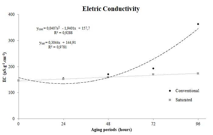 As the seeds aged, there was a decrease in vigor determined by the electrical conductivity test (Figure 3). It detected a significant increase in the amount of leachate from seeds subjected to aging using the traditional method. The seeds that aged for 96 hours presented a higher amount of leachate compared to seeds that aged during the other periods. Regarding the methodology using saturated solution, the values did not oscillate much among aging periods. The membrane system, which delimits the organelles and other cellular components, gradually organizes itself during seed maturation, reaching its maximum organization near physiological maturity. The deterioration process causes the loss of integrity of this system, thus releasing essential constituents to germination (Marcos Filho, 2015). By using the electrical conductivity test on Erythrina velutina Willd seeds previously submitted to accelerated aging, Guedes et al. (2009) found that seed vigor was greatly affected during accelerated aging, as evidenced by the increase in the amount of leachate released by seeds.