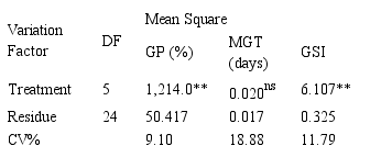 The analysis of variance of the germination percentage and germination speed index (Table 1) of P. moniliformis seeds showed significant effects (p<0.05) when seeds were submitted to different periods of immersion into sulfuric acid to overcome dormancy since the mean germination time was not influenced by the treatments.