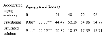 Due to the high humidity found in seeds exposed for 72 and 96 hours during the accelerated aging test using the traditional method (exclusive use of water inside the plastic box), there was proliferation of microorganisms. It is therefore a disadvantage to use the traditional method in comparison to the saturated solution method.