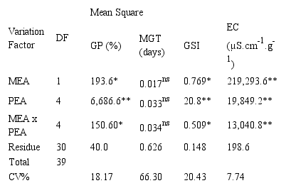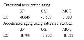 The Pearson's simple correlation coefficients (r) were also calculated among electrical conductivity (EC) and germination percentage (GP), and germination speed index (GSI) and mean germination time (MGT) for the different methods for the accelerated aging test using the Excel software.