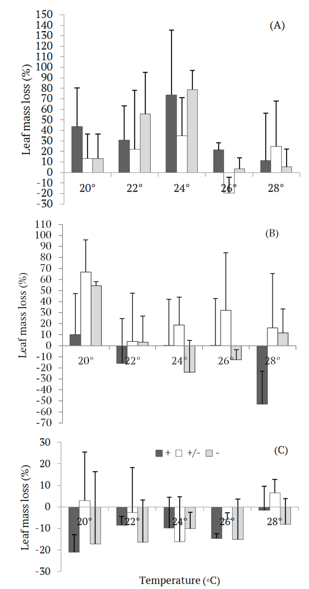 At the highest temperature (28°C), no increase in the consumption of better-quality leaf litter was found. Possibly, the conditioning that indirectly increases the nutritional value and the palatability of the leaf litter (Barlöcher & Graça, 2005) also ensures a better assimilation of nutrients than in the non-conditioned leaf litter at 27°C. The invertebrates increased their consumption to try to elevate their nutritional assimilation efficiency. This result was also verified in studies by Villanueva et al. (2011), who found that an increase in temperature with better-quality leaf litter led to a higher assimilation of minerals, such as phosphorus, compared to resources with lower nutritional value.