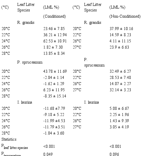 Conditioning the leaf litter seems to increase the use of only the higher quality resources. This, it has contributed to a more specialized behavior of Phylloicus sp. at intermediate temperatures. The higher-grade plant matter, when enriched with a primarily fungal microbial community (conditioned), can be more palatable (Martin, 1979; Dangles & Chauvet, 2003, Colpo, Ribeiro, Wesz, & Ribeiro, 2012). Furthermore, conditioned plant matter possesses a higher nutritional value because of the protein and lipid contents in the fungal tissues, which may comprise 50% of the leaf litter mass (Martin, 1979; Colpo et al., 2012). This leaf litter was capable of meeting the likely increased energy demands of Phylloicus sp. caused by the temperature increases. However, the non-conditioned litter (which did not suffer leaching) most likely hindered microbial colonization due to the effect of secondary compounds (Barlöcher & Graça, 2005). Reduced colonization makes these resources less palatable and less nutritive for the shredders (Abelho, 2001; Allan & Castillo, 2007) and leads to a more generalist behavior of the shredders at all temperatures.