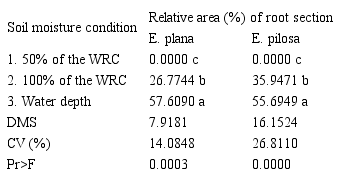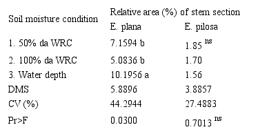 The analysis of the data related to the relative area (%) of the stem occupied by aerenchyma (Table 2), allows to verify that for E. pilosa there was no statistically significant difference (p-value > 0.05) between the treatments with different amounts of water in the soil (50% of the WRC, 100% of the WRC and 10 cm water depth). These results are due to the greater adaptation of this species to the flooded environment, since it is a common species in lowland rice production environments, as stated by Kissmann (1997). It is assumed that this characteristic is already incorporated into the genotype of the species for the longest period of adaptation to the flooded environment, and the plant forms more aerenchyms in the root cortex than in the stem cortex, in addition to adventitious roots on the soil surface, morphological changes that allow these plants to survive in this hypoxic environment.