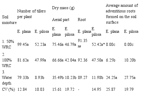 In Table 3, it is possible to observe that as the amount of water in the soil increased from 100% of the field capacity, adventitious roots were formed in the stem-root transition zone in the two species evaluated (E. pilosa and E. plana). The greater formation of adventitious roots on the soil surface was observed in the condition of water depth in response to the anaerobic condition and probably due to the use of this oxygen diffused from the aerenchyma system formed in the stem and roots for this oxidized soil zone, just below the flooded surface. In soybean plants grown in flooded lowlands, Pereira, Castro, Souza, and Magalhães (2008) found that the adaptability mechanism of this grass to anaerobiosis is not only the formation of aerenchyma, but mainly the formation of adventitious roots.