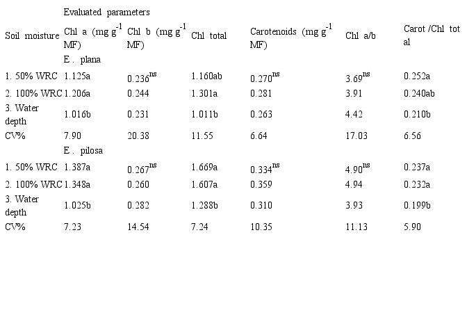There was a significant increasing reduction (p < 0.05) in the concentration of chlorophyll a and total chlorophyll pigments (Table 6) when the E. pilosa and E. plana plants were subjected to increasing amounts of water in the soil, especially in the condition of 10 cm water depth. This measure reinforces the values found for the electron transport rate (ETR) whose response was similar, which allows us to infer that the lower amount of chlorophyll a pigments and the lower electron transfer by PSII, affected photosynthesis in the plants studied (Figure 3) explaining their lower growth and development.