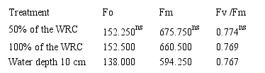 The results found for the chlorophyll a fluorescence variables, such as initial fluorescence (Fo), maximum fluorescence (Fm) and effective quantum yield of PSII (YII) 125 were not affected by the increase in the amount of water in the soil (not significant p > 0.05).