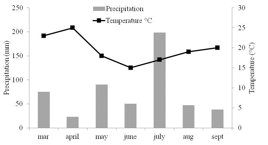 Flowering was characterized when approximately 50% of the plants showed at least one flower at anthesis, 35 days after sowing. Flowers were tagged with colored plastic ribbon to differentiate them at anthesis. For the flowers tagged, harvest was performed in order to evaluate the seed development at 13, 22, 26, and 28 days after anthesis (DAA). Climactic data recorded during seed development is shown in Figure 1.