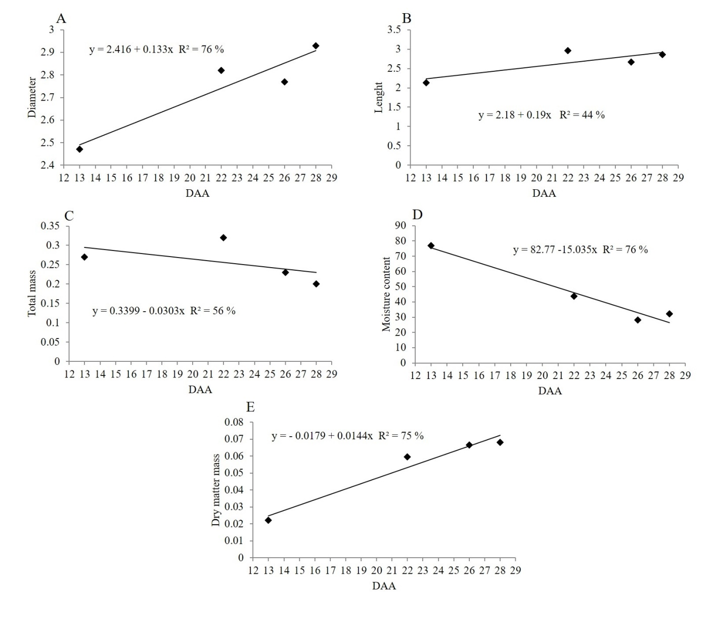 Seeds showed a total mean mass of 0.310 and 0.248 g, 14 and 28 DAA, respectively (Figure 2C); on the same dates, seed water content was 72.2% and 29.5%, respectively (Figure 2D), indicating that seeds still showed a high water content at harvesting.