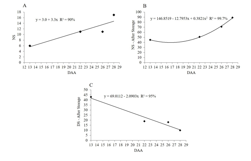 Seed-development stage had a significant effect on the percentage of normal seedlings obtained, which increased linearly up to 28 DAA (Figure 3A). Although low germination results were observed for all evaluation dates. We verified that seed germination capacity increased during development; furthermore, the maximum amount of dry matter accumulation was concomitant with the maximum seed-germination rates recorded.