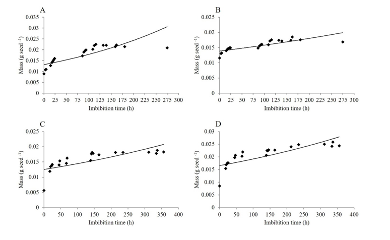 Water absorption curve. Seeds were placed on petri dishes lined with two sheets of germitest paper soaked in an amount of distilled water equivalent to 2.5 times the mass of the dry paper and were kept in B.O.D. at 25°C (Brasil, 2009). Seeds were weighed individually using a precision scale (0.0001 g) every two hours following the start of the test, and until the emergence of the primary root. The test was performed using four replications with five seeds each, on each evaluation date.