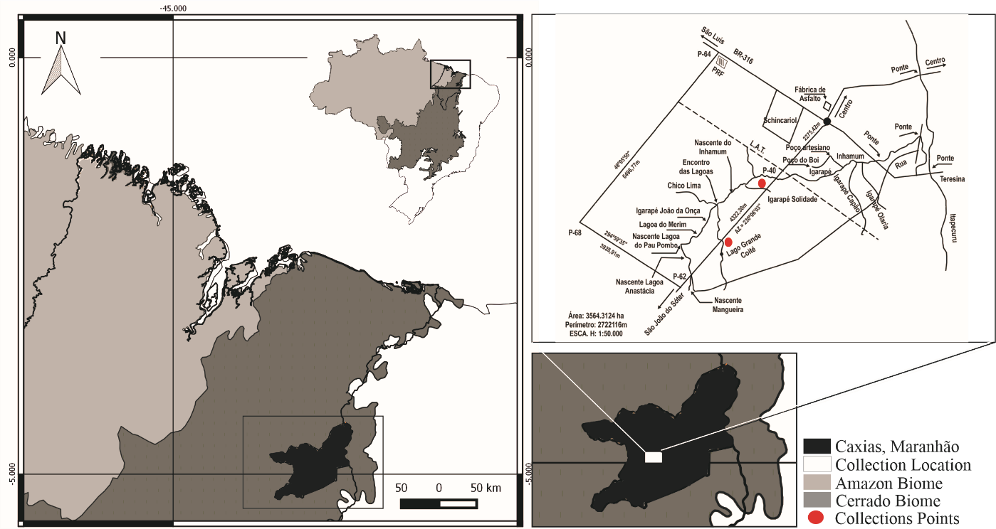 Fresh leaves of Croton betaceus Baill (3.5 kg/-4.885973, -43.410064) and Croton lundianus (Didr.) Müll. Arg (5.5 kg/-4.913059, -43.429960) were collected in the Cerrado region of Caxias, Maranhão, Brazil (Figure 1) during the morning shift. They were used for the bioassays and had their exsiccates deposited at Herbário Afrânio Gomes Fernandes (HAF), under voucher HAF-04642 and HAF-04644, respectively. The procedures were submitted to Sistema Nacional de Gerenciamento do Patrimônio Genético e do Conhecimento Tradicional Associado (SisGen) under A8C212C.