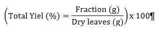 After removing the last fractionation solvent (ethyl acetate), we considered the methanol/water residue to be also a fraction. Then, all were evaporated and lyophilized separately, resulting in four fractions: hexane (HX), chloroform (CH), ethyl acetate (AC) and hydromethanolic (HD) plus the crude fraction (CE).According to the manufacturer, the solvents used are removed from the solution by evaporation, obtaining a maximum of 0.001 to 0.003% residue. Thus, they did not interfere in toxicity analyzes. The total yield (%) is given by the weight of the crude extract (g) after evaporation and lyophilization divided by the weight of dry leaves (g). The process followed the model by Ûchoa et al. (2016).