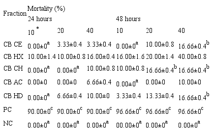 The crude ethanolic extract and the fractions of Croton betaceus showed larvicidal activity with different mortality rates. The bioassays made with the crude extract (CBCE) from this species showed larvicidal potential of 3.33%, in 24 hours, at the highest concentrations (20 and 40 µL).In 48 hour analysis, larval mortality increased in both concentrations, being 10% at 20 µL and increasing significantly to 16.66% at 40 µL(Table 1).