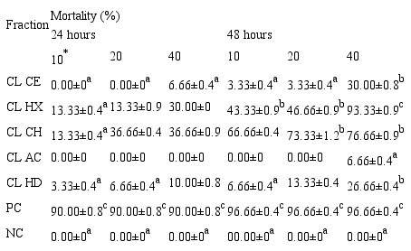 In bioassays with C. lundianus crude extract (CLCE), it was observed larvicidal activity of 6.66 % at 40 µL (24 hours). In 48 hours, all concentrations showed mortality, with 3.33% at 10 and 20 µL and 30% at 40 µL (Table 2).