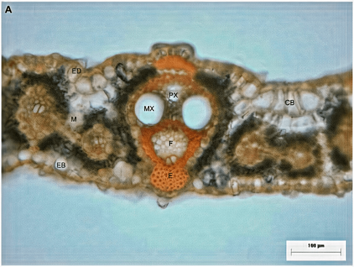 A monolayer epidermis with thickened and lignified external periclinal cell wall delimited the leaf blade of the four elephant grass genotypes that have been studied, with stomatic complex in both faces and cells. At the abaxial face, the epidermis presented buliform cells. The mesophyll tissue organization reflects the typical Kranz-type leaf anatomy, displaying cells that are associated with the vascular bundles (Liu, Maimaitijiang, Zhang, Ma, & Lan, 2020). The vascular bundles present collateral disposition surrounded by sclerenchymatous tissue and xylem differentiated into protoxylem and metaxylem. According to Ribeiro Júnior et al. (2017), a more extensive arrangement of the protoxylem may associate with the anatomy of the vascular cylinder, as the bundles of the metaxylem and phloem are smaller and do not occupy so much space.