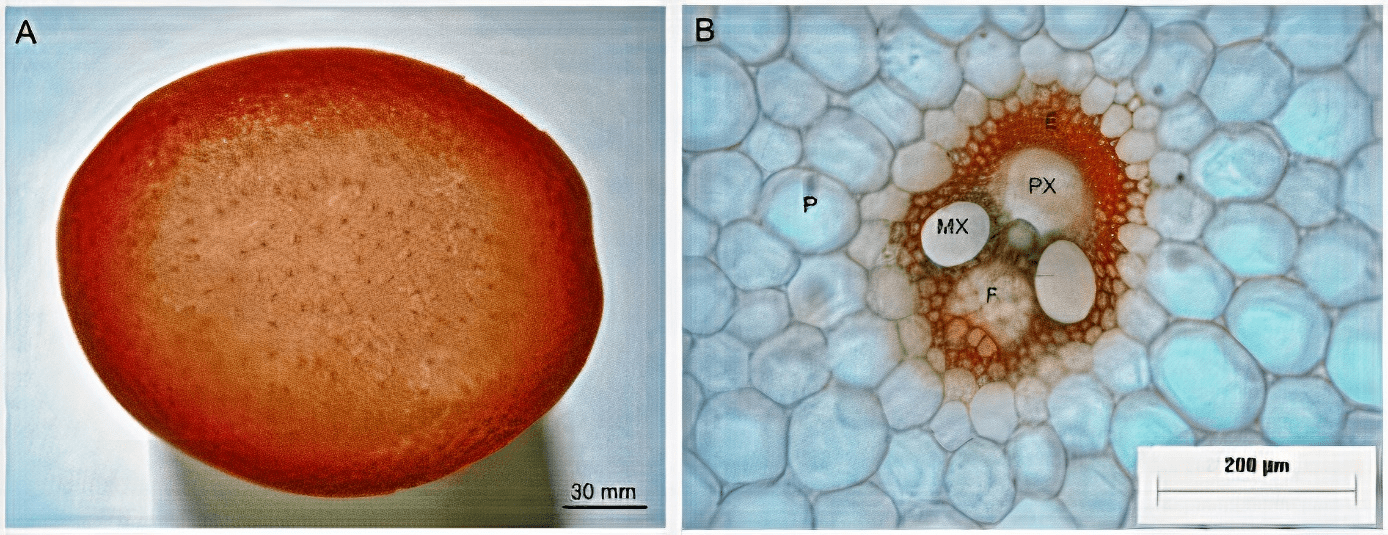The transverse section of the elephant grass stem highlighted numerous vascular bundles in the outlying area. In the central area, the bunches are dispersed in the fulfillment of parenchymatic tissue, characterizing the vascular system of the atactostele type (Figure 2, A). A sclerenchymatous vascular bundle entraps the collateral vascular one (Figure 2, B).