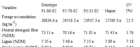 The dry matter average accumulation was 25314.9 kg ha-1. However, the DM production did not display significant differences (p > 0.05) among the genotypes and the Napier cultivar at 70 days of re-growth (Table 1).