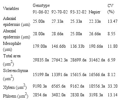 Averages followed by different letters, in the line, differ statistically by the Tukey’s test at 5%.Tables 2 and 3 describe the anatomical features of the leaf blades and stems of the different genotypes and the Napier cultivar.