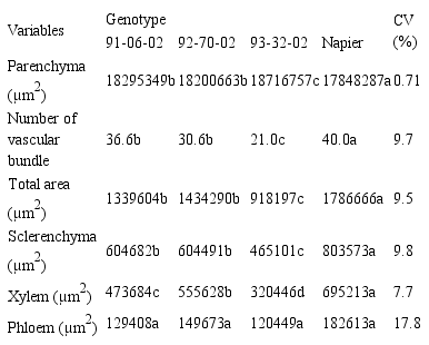 Anatomical characteristics of the stem of different genotypes of elephant grass and the cultivar Napier at 70 days of re-growth.