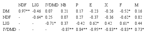 The proportion of mesophyll tissue of the elephant grass leaves, at 70 days of re-growth, was correlated negatively (r = -0.73) with IVDMD (Table 4). The parenchymatic ground of the stem displayed positive correlation coefficients (r = 0.84) and highly significant with IVDMD.