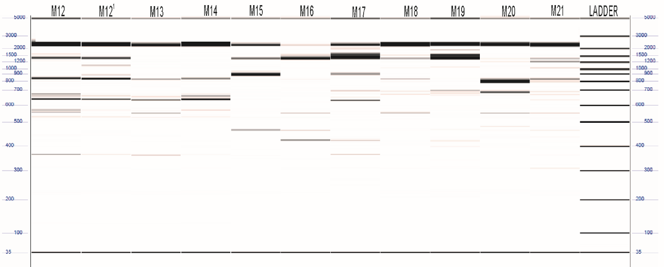The obtained amplification fragments were separated through capillary electrophoresis using the DNF-915 (35-5000 bp) Kit in a Fragment Analyzer™ (Advanced Analytical Technologies, USA) at 9 KV for 90 or 120 minutes. The time was determined based on the number of bands obtained with the primers. For the analysis, the samples were diluted to a final volume of 24 μL at a ratio of 4 to 6 μL of amplified DNA from each accession to 18 to 20 μL of elution buffer, where the volume was determined based on the fragments amplified by the primers.