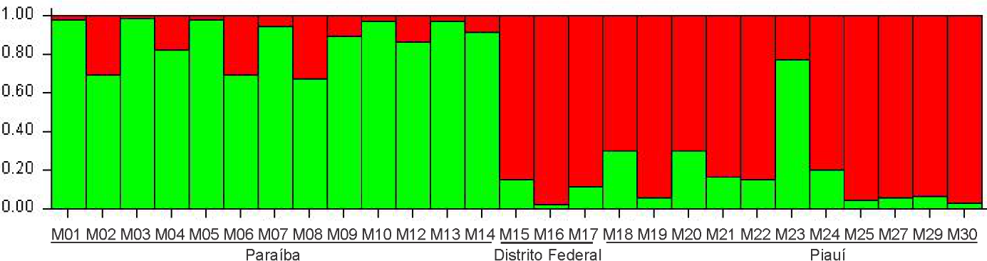 The ΔK statistic of Evanno et al. (2005) indicated K = 2 as the probable number of genetic groups for the three mangabeira populations. Thus, the population from Paraíba was composed of one genetic group (green), and the populations from the Distrito Federal and Piauí composed another group (red). In addition, allelic sharing was observed between these two genetic groups, and accession M23 from Piauí showed a greater chance of belonging to the Paraíba genetic group, which aligned with the UPGMA grouping in which this accession was grouped within the Paraíba accessions (Figure 2 and 3).