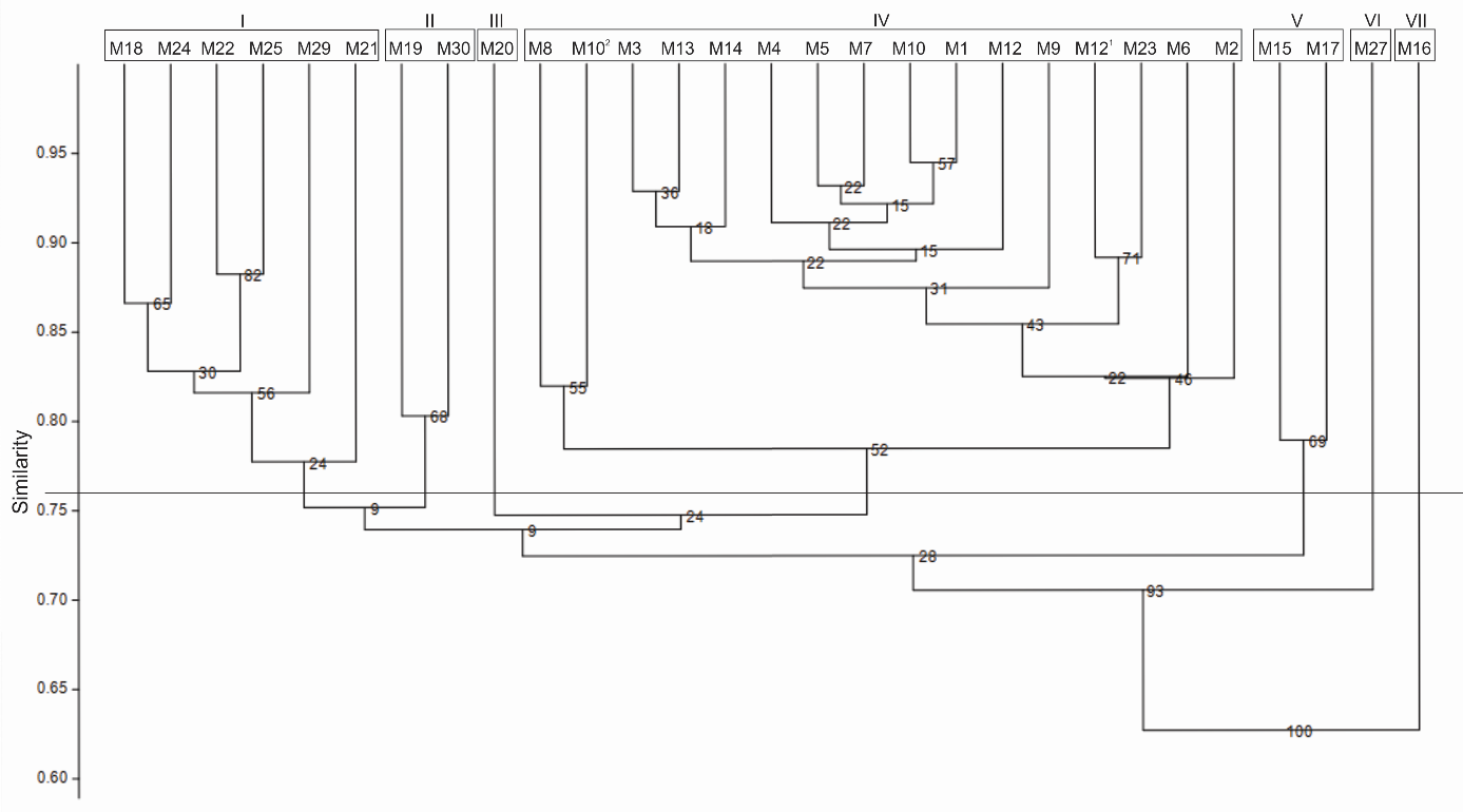 The value of the Jaccard similarity coefficient among the accessions ranged from 0.57 (from M16 to M23) to 0.94 (from M1 to M10). The value of the cophenetic correlation (r) was equal to 0.90, indicating the reliability of the grouping obtained with the UPGMA method, which generated a dendrogram representative of the original data matrix. The average value of the Jaccard coefficient considering all loci was 0.76. This value was used as the dendrogram cut-off point. Thus, the accessions were separated into seven groups. Group I was composed of six accessions from Piauí, identified as M18, M21, M22, M24, M25 and M29. Group II was composed of two accessions from Piauí, identified as M19 and M30. Groups III, VI and VII were composed of single accessions, identified as M20, M27 and M16, respectively, with accessions M20 and M27 from Piauí and M16 is from the Distrito Federal. Group IV included accessions from Paraíba except for accessions M102, M121 and M23, which were from Bahia, Sergipe and Piauí, respectively. Group V included two accessions from the Distrito Federal, identified as M15 and M17 (Figure 3).