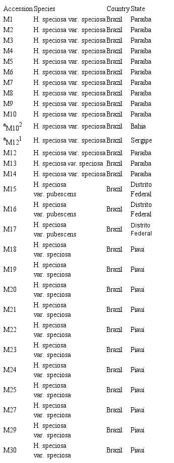 Twenty-nine mangabeira accessions from the Germplasm Bank of Embrapa Meio-Norte, located in Teresina-PI at a latitude of 5°02'05.9" S and longitude of 42°48'15.3" W, were used in this study. All of the accessions belong to the species H. speciosa var. speciosa except for three accessions of the species H. speciosa var. pubescens (Table 1).