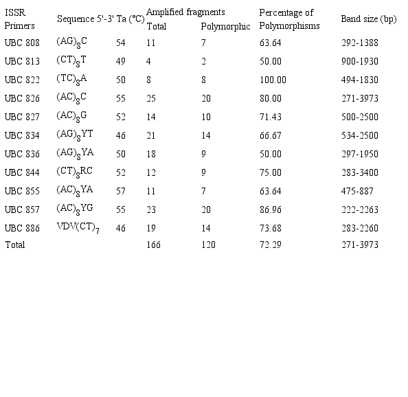 One way to determine the genetic diversity of a species is the use of molecular markers that indicate differences between plants and that are not influenced by environmental factors. Among the markers that are available, the application of inter simple sequence repeats (ISSRs) is a simple technique that employs a single repeat sequence primer that is complementary to microsatellite regions. Thus, this type of marker provides a fast and reproducible technique through which DNA fragments shared between identical microsatellite regions are amplified. In addition, the use of ISSRs allows broad coverage of the genome and is applicable in the study of genetic diversity in numerous species since it does not require previous knowledge of the target DNA sequences (Ng & Tan, 2015).