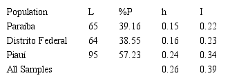 The number of polymorphic loci ranged from 64 (Distrito Federal population) to 95 (Piauí population). Nei’s genetic diversity (h) was 0.26 when considering all accessions, and the values for each population ranged from 0.15 to 0.24. The Shannon index (I) ranged from 0.22 to 0.34 in the populations and 0.39 when considering all accessions. Therefore, the studied populations of mangabeira presented low or moderate levels of genetic diversity. Among the populations, the Piauí population showed the highest level of genetic diversity (Table 3).
