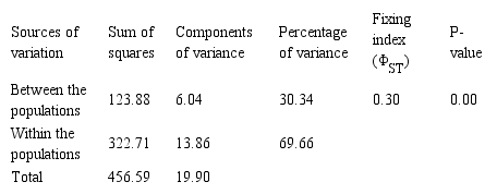 The AMOVA showed that most of the genetic variability existed within the populations (69.66%). In addition, there was high genetic differentiation between the populations, with a ΦST value of 0.30 (Table 4), and the GST indicated that 32.46% of the variation existed between the populations, with gene flow (Nm = 1.04) occurring between them.