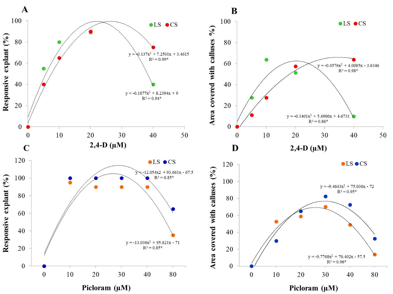 The quadratic behavior of the percentage of responsive explants indicates that 2,4-D concentrations in the interval between 21.94 µM and 26.46 μM had a tendency to reduce that percentage in the explants obtained from leaf and cotyledon segments, respectively. The 2,4-D is the one of the most commonly used auxin in tissue culture for induction of callogenesis and somatic embryogenesis in many plant species (Passamani et al., 2020).
