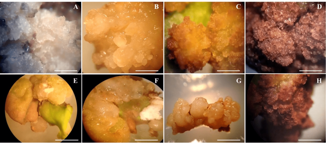 The success of callus induction and subsequent callus growth in subculture depends of explant type, of the exogenous supply of plant growth regulators (PGRs), as well as the type and concentration of PGR (Wójcikowska & Gaj, 2017; Adil et al., 2018).